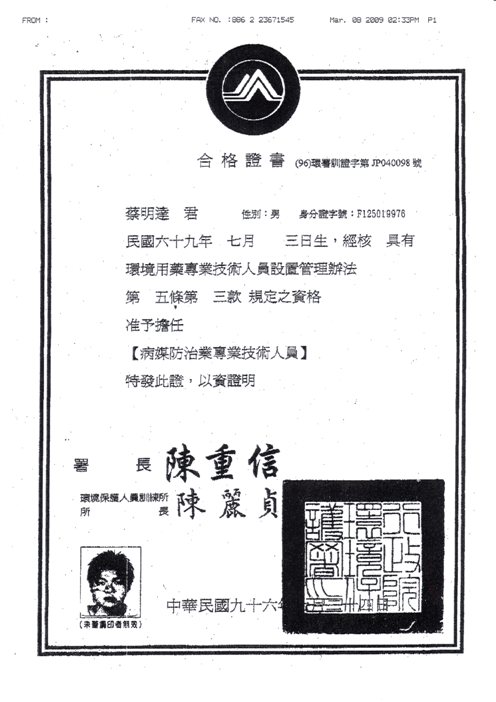 病媒防治專業人員證書
