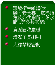 環境衛生維護(大廳、安全梯、電梯頂樓及公共廁所、茶水間...等公共空間) |